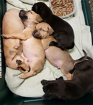 April 2016 GOOD NEWS May Update: Michele fostered these 3 Shepherd/Labrador mix pups (pictured here at 5 weeks old)... 2 males and 1 female They have all found new homes! |